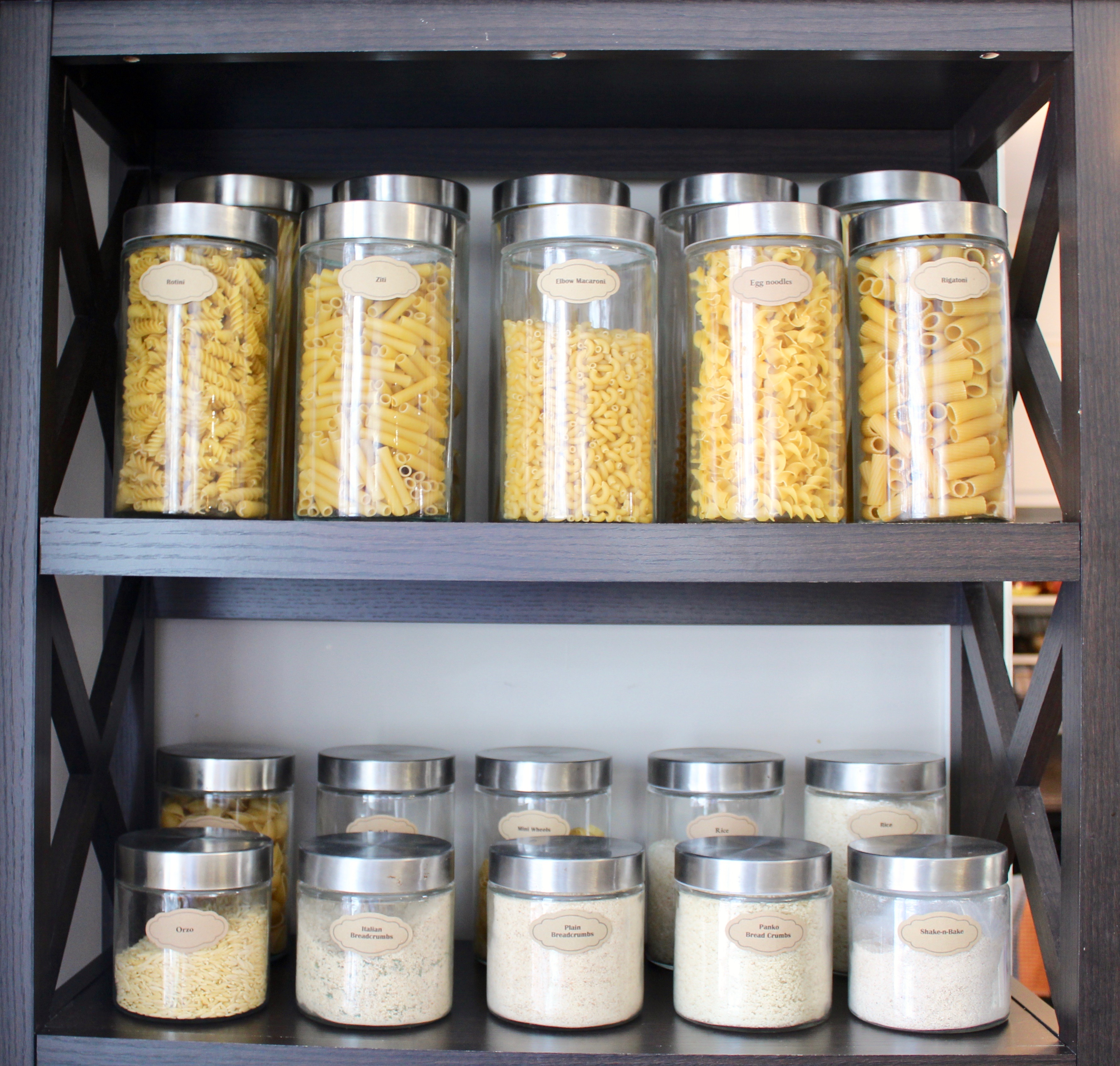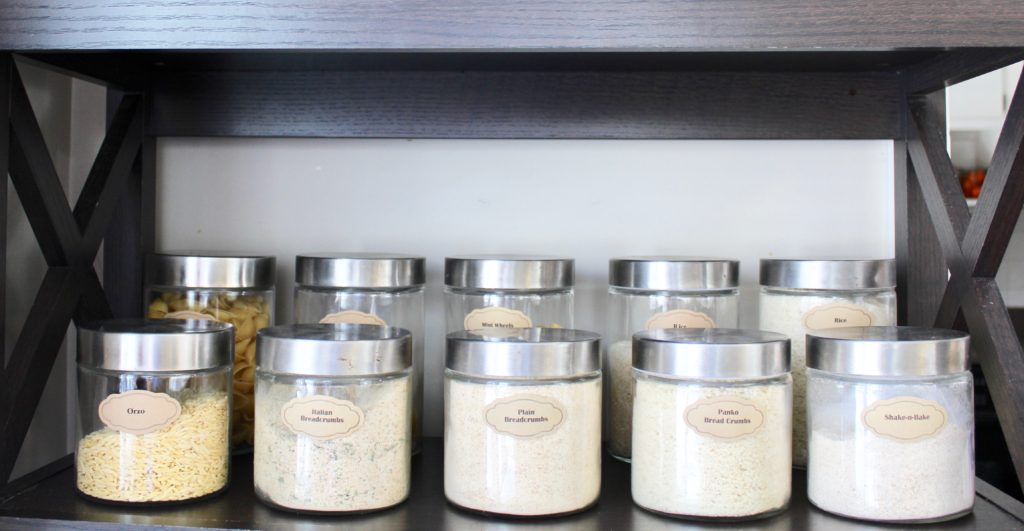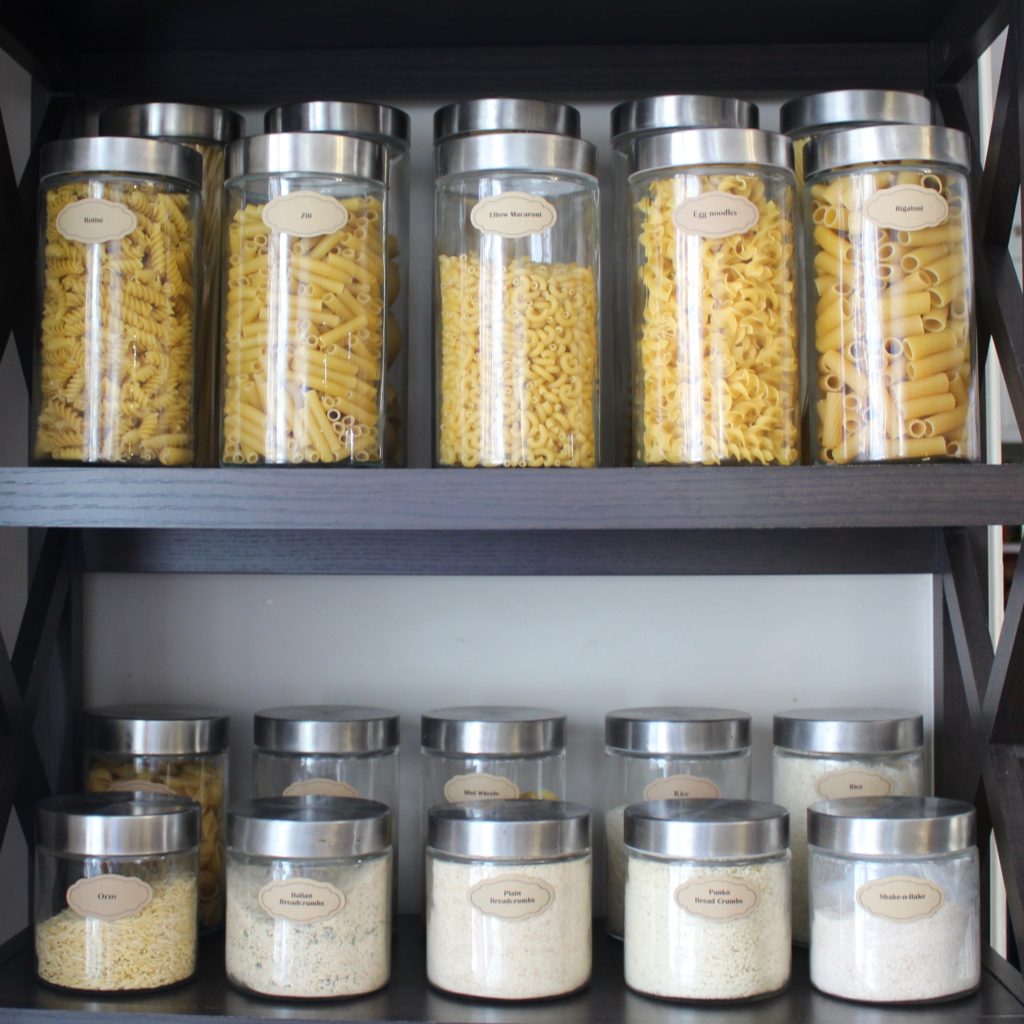 I used the smaller glass containers for other essentials like rice and breadcrumbs on the next shelf down.
