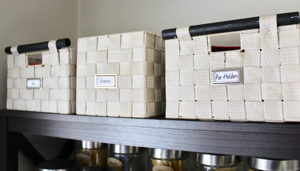On the very top shelf, we added three baskets for these essentials. Up until now, these things have not had a good home, and these baskets have been so handy.