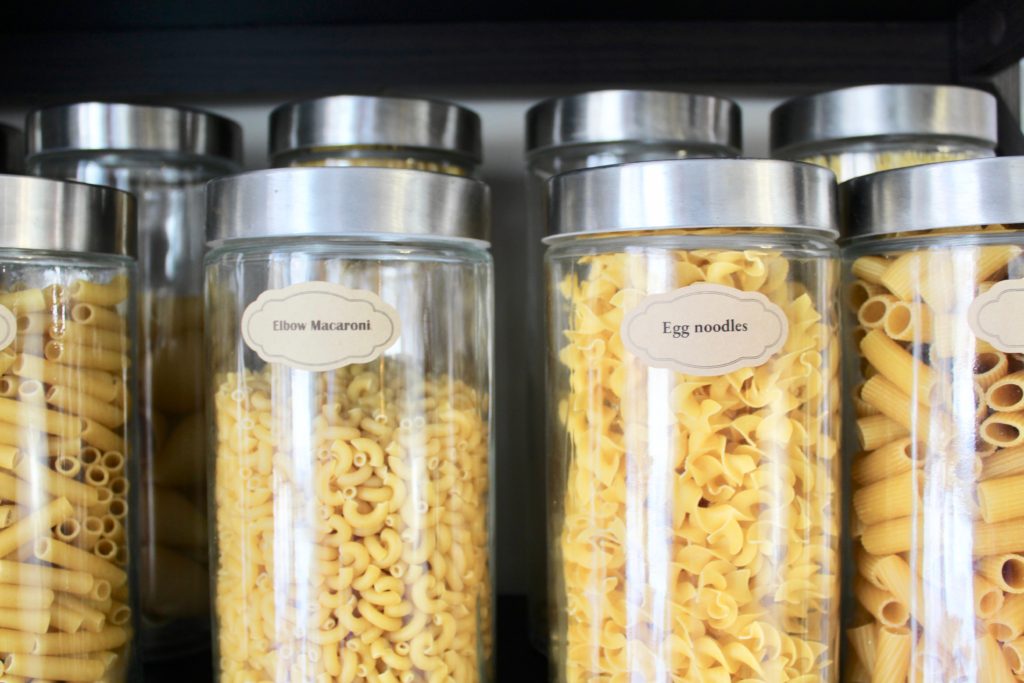 We filled these clear glass containers with all of our favorite pastas, and added a label to each one. Easy peasy.