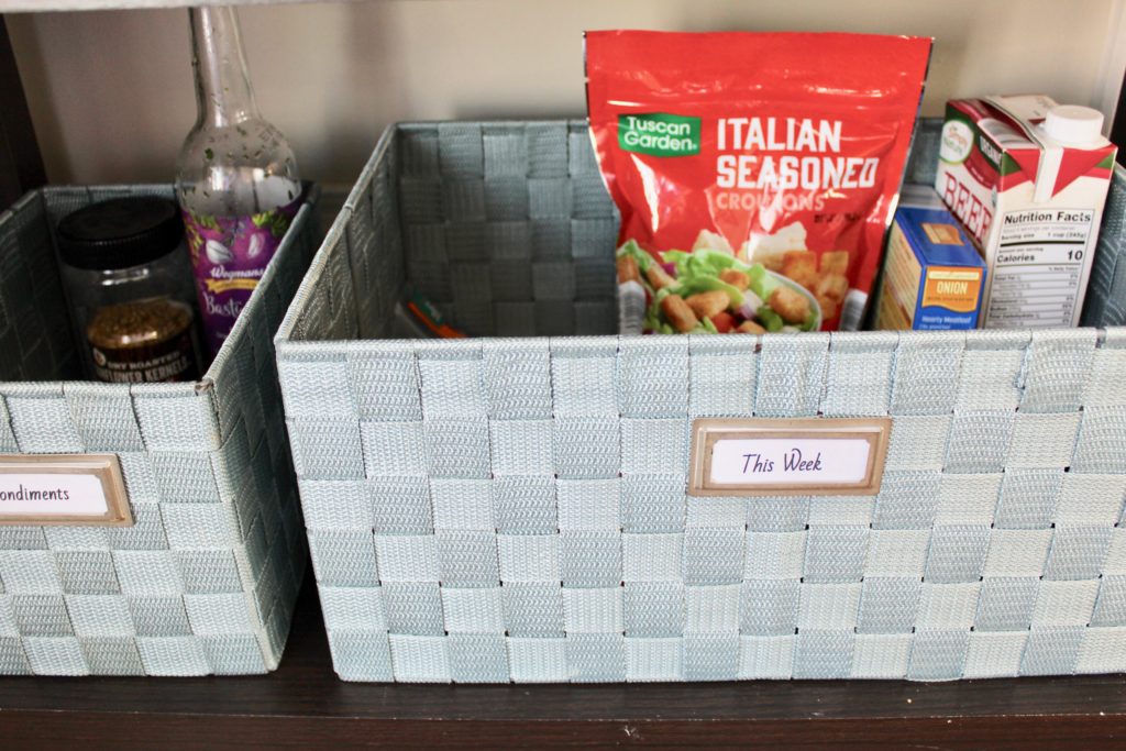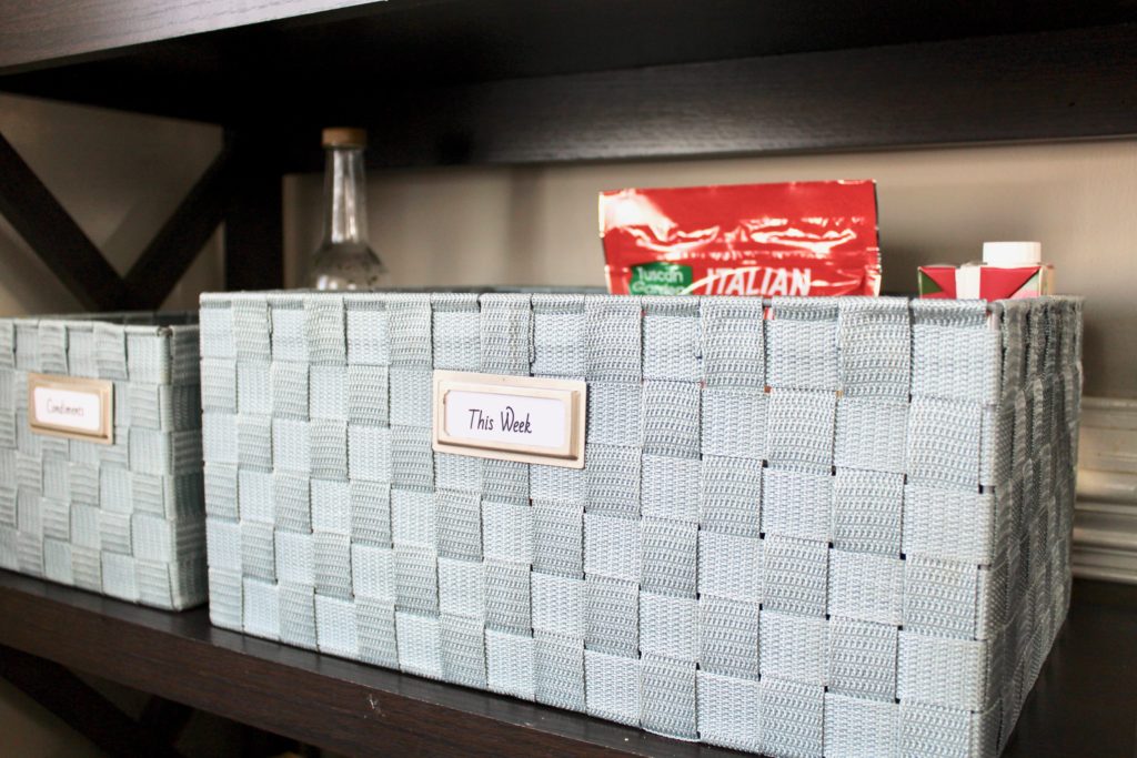 On the next shelf, we have two baskets: one for condiments, and one labeled This Week.