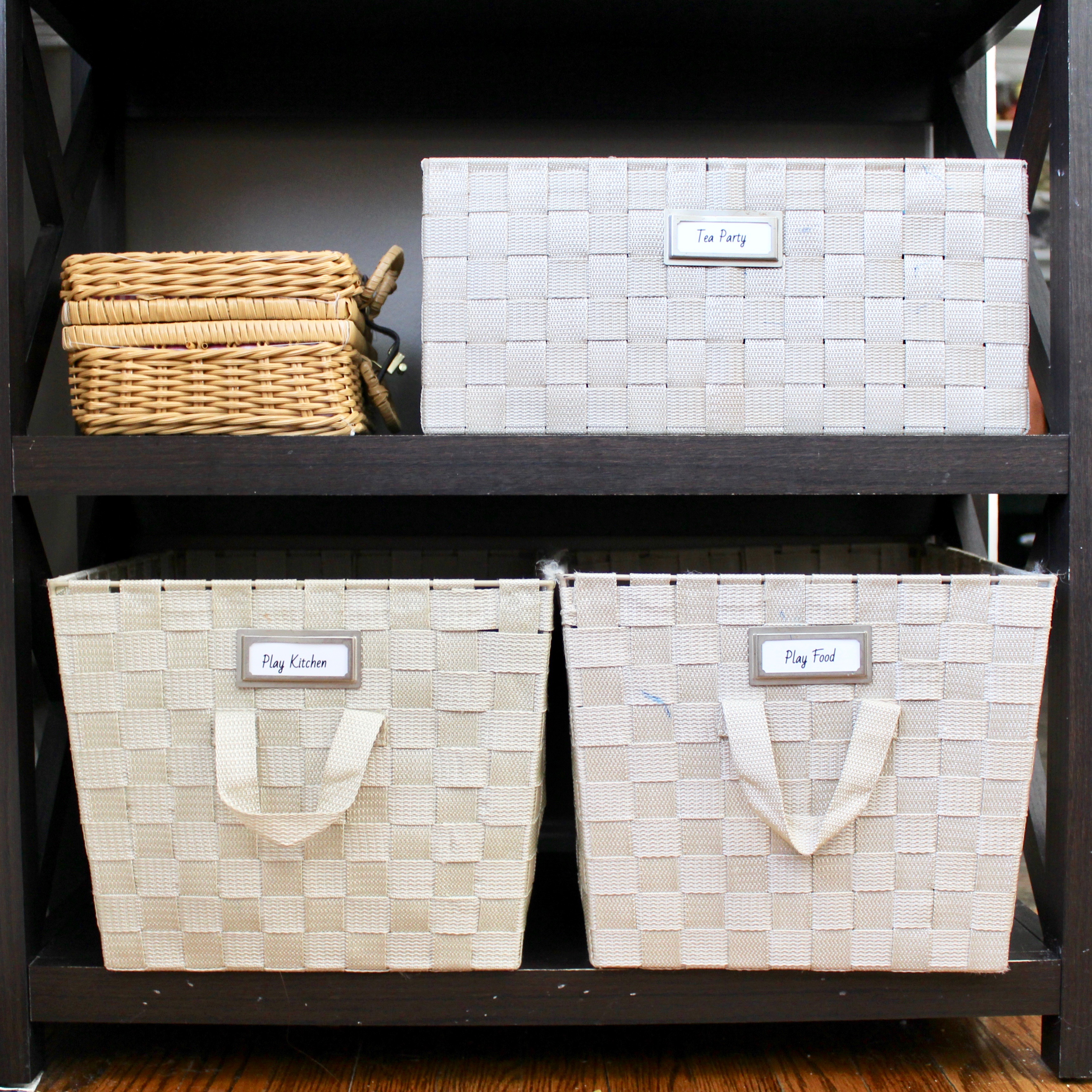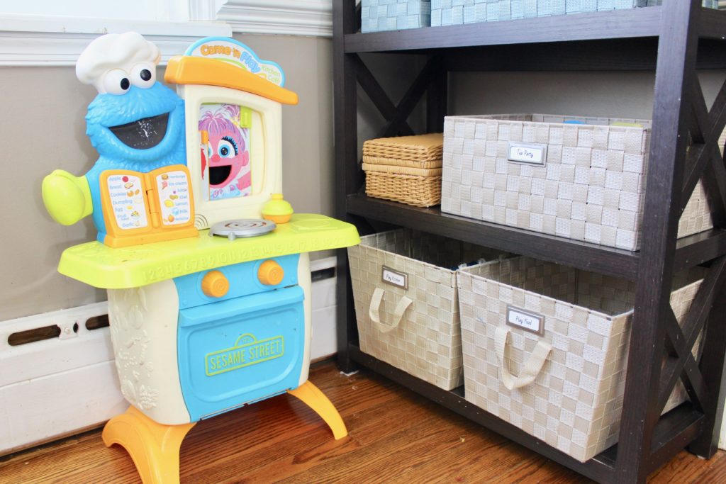 I use the lowest two shelves to help contain all of the play kitchen items, like our tea party supplies and play food. We love keeping these items in the dining room. That way, when we cook, our toddler can “cook” along with us.